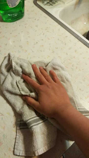 1. después de que termines completamente, seque cualquier exceso de agua con la toalla de mano (¿recuerdan los counter tops, tal vez, lavado en el paso de lavado?). Como ya mencionado, esto mantiene su laminado (y aun bloque de carnicero) contador tops de combeo y burbujeante.