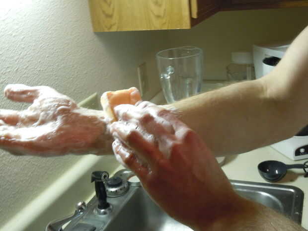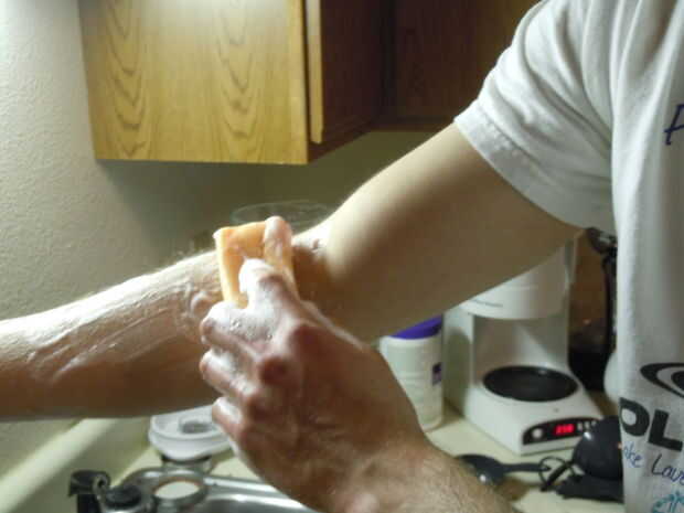 ADVERTENCIA: Al limpiar la región del codo, tenga cuidado no toque la camisa o la camiseta ya que contamina las manos.