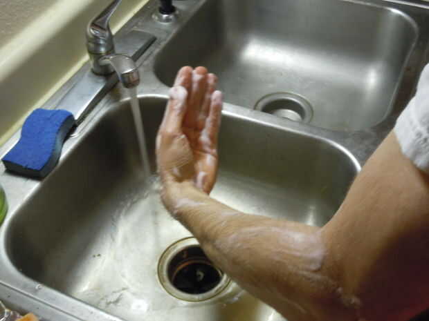 Al enjuagar el jabón, la meta es que todo lo van desde dedos hasta los codos. Esto es esencial para mantener las manos estériles.