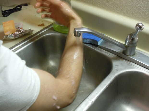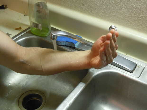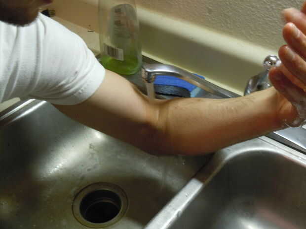 Punto de los dedos y doblar su brazo. En un movimiento de barrido, primero tener agua retirar el jabón desde los dedos, luego las muñecas y luego los brazos. Después de hacer uno de los brazos, repita el procedimiento con el otro brazo.