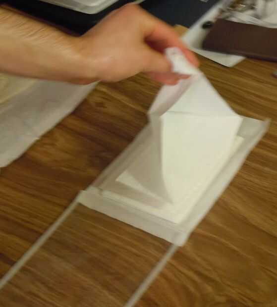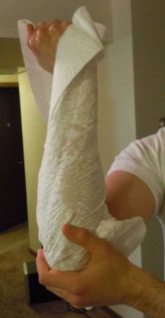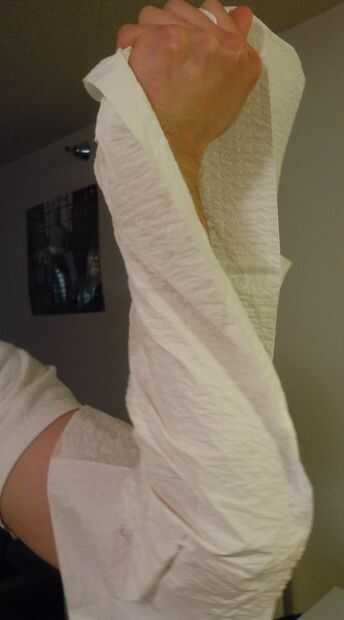 Toalla superior del gancho agarrador y deje que se despliegan, asegurándose de que no toque la mesa o su cuerpo. Embrague de parte superior en una mano y use la otra mano para agarrar el extremo danging para secar el brazo. Gota usa toalla para tierra y recoger la segunda toalla en mano mojada. Utilice el mismo procedimiento.