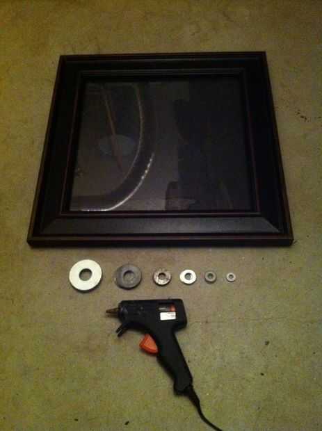 Un marco antiguo, arandelas de tamaño diferentes (en este caso siete conjuntos de tres) y una pistola de pegamento caliente.