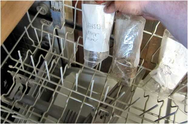 La bolsa se coloca en el estante superior del lavavajillas con la abertura hacia abajo.