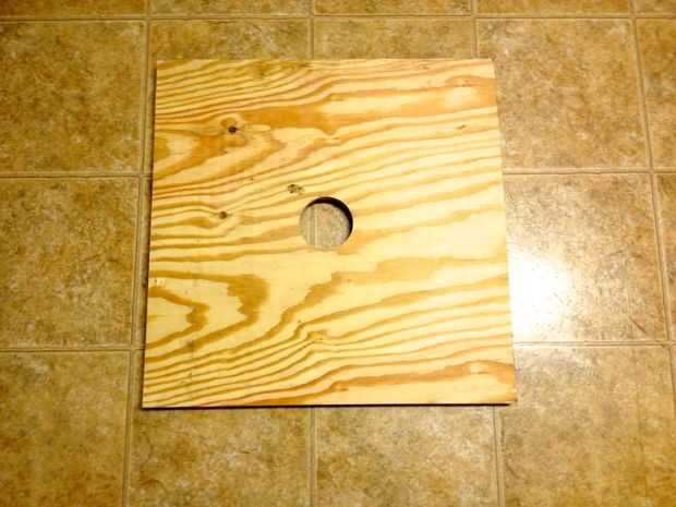 Tomar un tablero de contrachapado de 2'x 2' y buscar/marcar el centro. Utilice el tubo de PVC de 3" para dibujar un círculo alrededor de la marca. Corte o taladre el agujero 3" en medio de la Junta. Sierra de calar trabaja mejor.