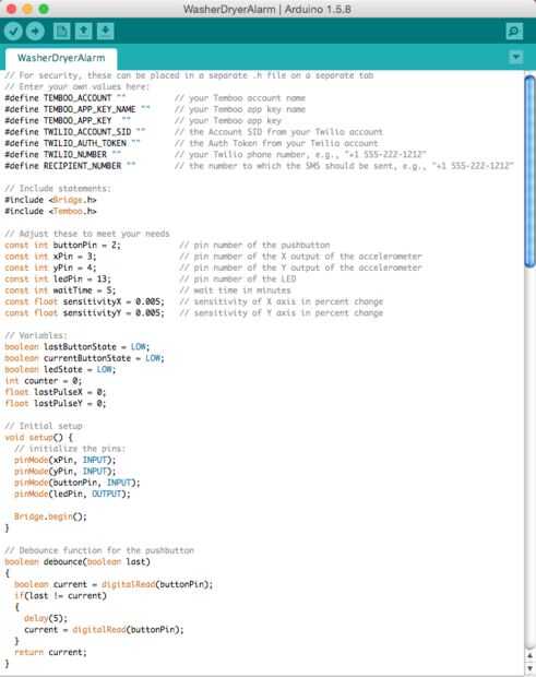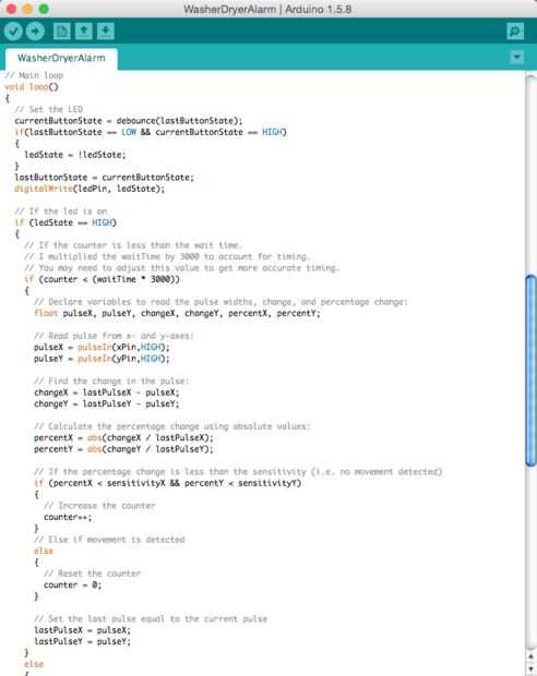 1. Descargar el archivo WasherDryerAlarm.ino y abrirlo con el software de Arduino.