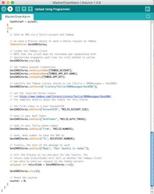 1. "waitTime" es aproximadamente cuántos minutos el sistema esperará hasta que envíe un mensaje de texto SMS. Esto es para tener en cuenta cuando la máquina es llenar de agua o estar inactivo durante su ciclo y no vibra. 5 minutos funcionó en mi caso, pero puede que necesite ajustar esto. Además, tenga en cuenta que el tiempo no es exacto y era sólo una aproximación.