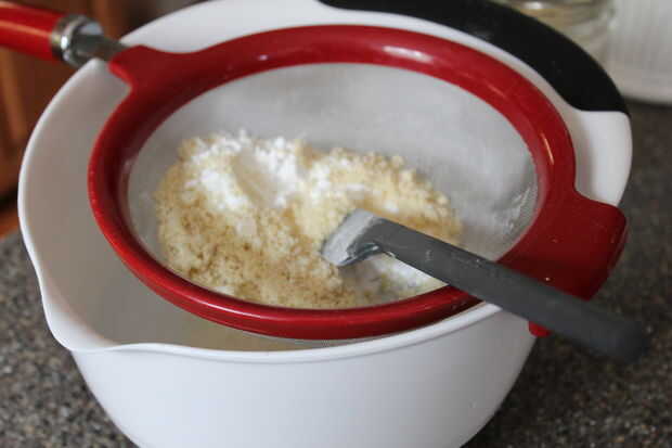 Tamizar la harina de almendra y en polvo azúcar en porciones pequeñas.
