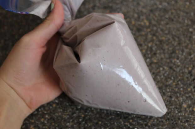 Llene un plástico o una manga pastelera con la masa. Prefiero utilizar una bolsa de zilpoc, porque mi Manga pastelera no es muy conveniente.
