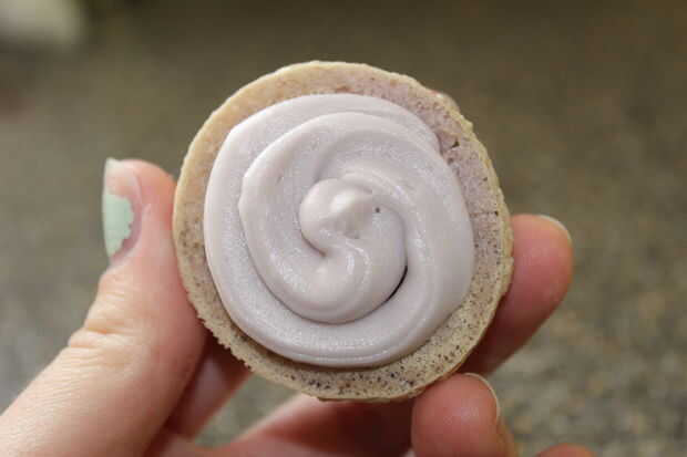 Tubo un pequeño círculo sobre una galleta y ligeramente sandwich otra galleta en la parte superior.