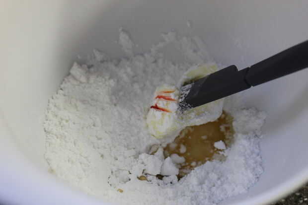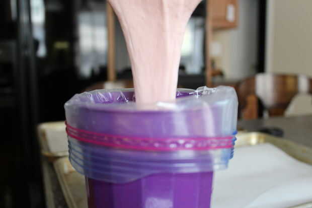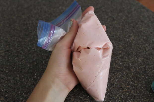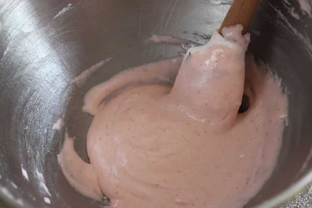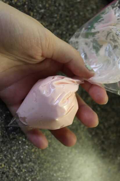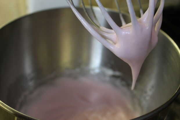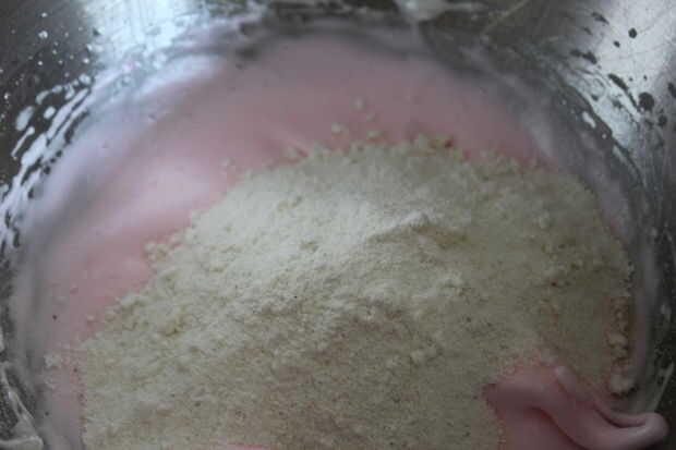 Repetir todo el proceso pero con el colorante alimentario rosa y agua de rosas.