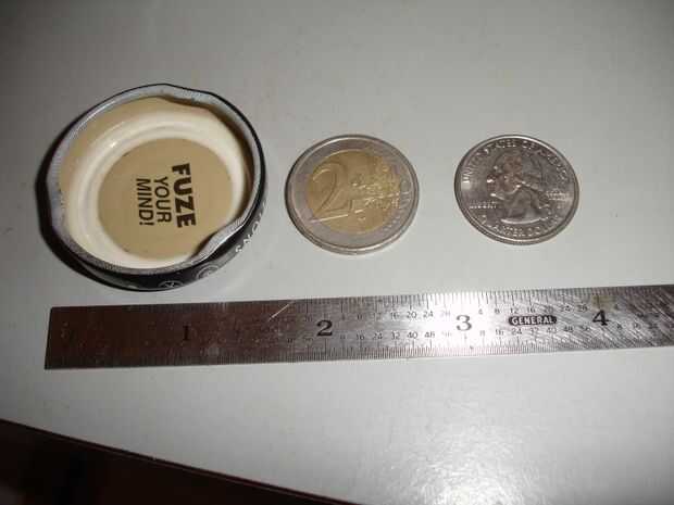 Para la escala, vea la tapa de la botella de vidrio junto a un gobernante, un cuarto de los E.E.U.U. y una moneda de 2 euros.