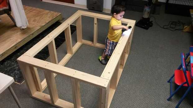 Este es el soporte inferior. Es cuadrado y está listo para el panel en la parte superior pero que los niños pequeños es en la forma pero es asegurándose de que la madera es buena y recta. Había precortado toda la madera necesitada. Los postes son vigas regulares y madera no pretratado. Añadir mucho peso a la estructura. No utilizo clavos debido al peso que iba a ser cuando los perros se moverían usé tornillos que fueron 3 1/4" de largo.