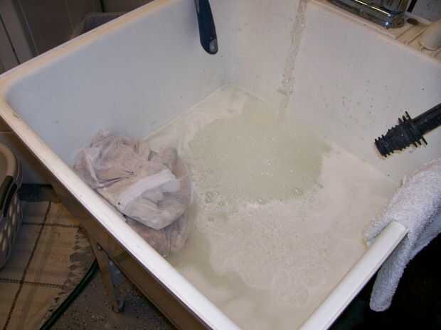 Después de 15 minutos, escurrir y luego repetir el proceso con un enjuague de agua caliente. Si el agua sigue turbio, repita el proceso de agua y jabón una vez más y luego enjuague.