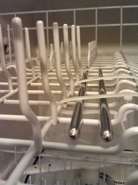 Palillos de aluminio son muy fáciles de limpiar... con la mano. En el lavavajillas, son demasiado estrechas para los agujeros en el cesto para cubiertos desmontable y muy ligero soportar las ráfagas de agua desde abajo. Después de muchos lavados donde tengo que recoger los palillos en el suelo del lavavajillas, decidí que era tiempo de hacer un cambio.