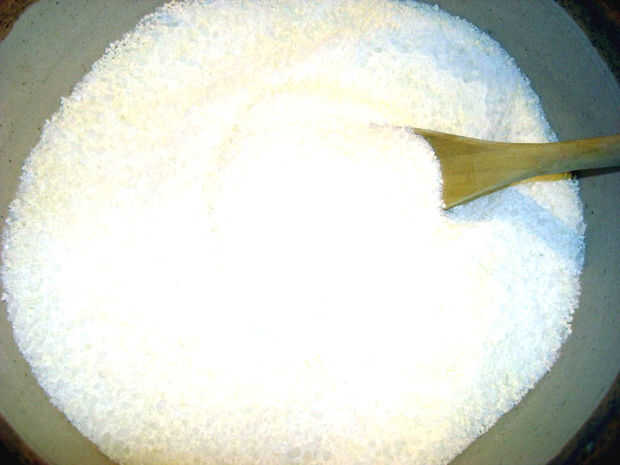 hace alrededor de 40 golf pops del tamaño de una pelotaLa parte más delicada de esta receta está realmente ejecutando simultáneamente dos diferentes tandas de mezcla de krispies de arroz - un té verde (matcha) y una fresa. Ambos deben ser al mismo t
