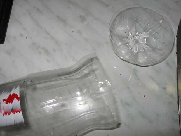 Corte el fondo de la botella con el cuchillo (tijeras). Use la uña para hacer 2 agujeros opuestos. Ate la cuerda a los agujeros.
