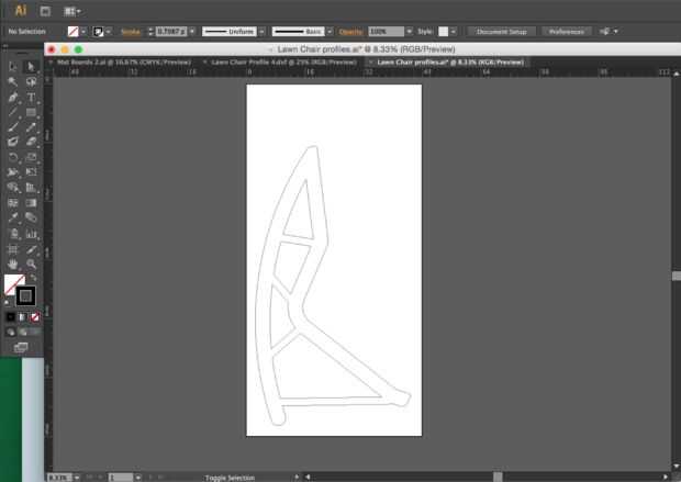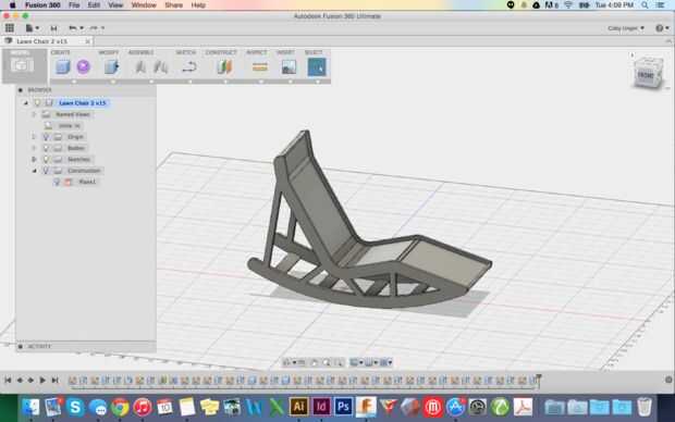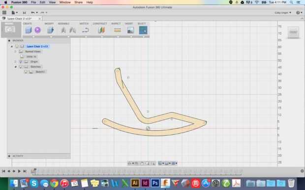 Diseño de la silla de césped en fusión 360 y utiliza Illustrator para extraer los perfiles para la impresión. Después tuve un archivo digital de Perfil de la silla solía una impresora de gran formato para hacer una pegatina gigante con forma de silla en él. Utilicé una técnica perfeccionada por Jon-A-Tron para evitar el uso de una máquina CNC para este proyecto. Para más detalles sobre la fabricación digital a mano Consulte este enlace. Diseño de la silla se basa en la geometría de algunas tumbonas que encontré muy cómodo.