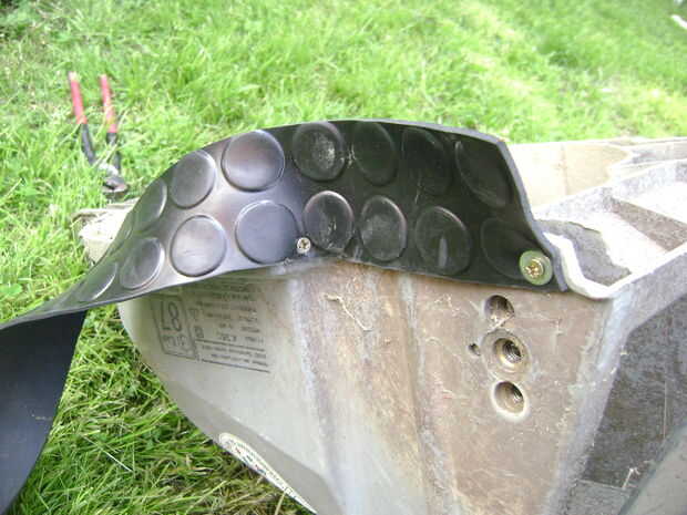Para evitar el lanzamiento de piedras y otros proyectiles peligrosos de las cuchillas de giro me warapped el cuerpo con zócalos de goma. Utilicé la estera del piso de goma, pero que resultó para ser un poco endeble. Recomendaría algunos cuero grueso o tal vez caucho de neumático de coche.
