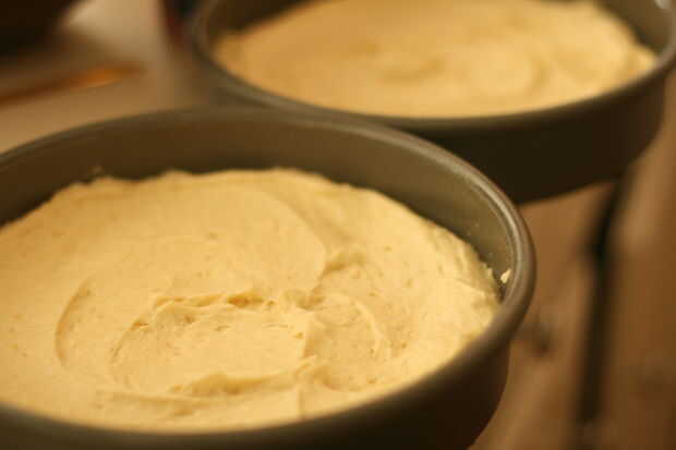 Dividir la torta en cacerolas preparadas. Hornear por 40 minutos o hasta que la torta cuando se presiona suavemente con los dedos. Enfriar por 20 minutos, luego quitar la torta de los moldes y enfriar en rejillas de alambre hasta que enfríe totalmente.