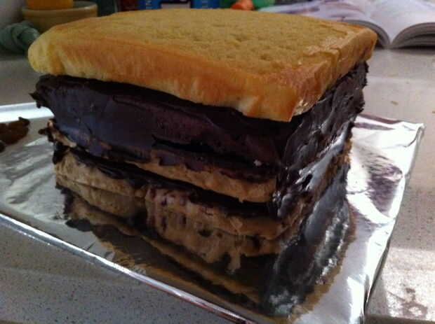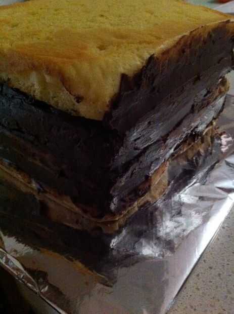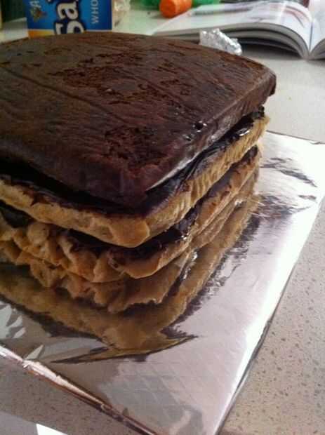 Coloque la primera capa hacia abajo en la placa de presentación, aplique 1/4 de la ganache en la parte superior, luego coloque en la capa siguiente. Repita esto para las capas restantes pero no la última porción de ganache en la parte superior. Uso el ganache restante a spak rellena los bordes de las capas no encuentran muy bien. Emprolijar los bordes en esta etapa le dará un mejor resultado al final. Una vez que haya rellenado los agujeros en cada uno de los lados está listo para poner la guinda final.