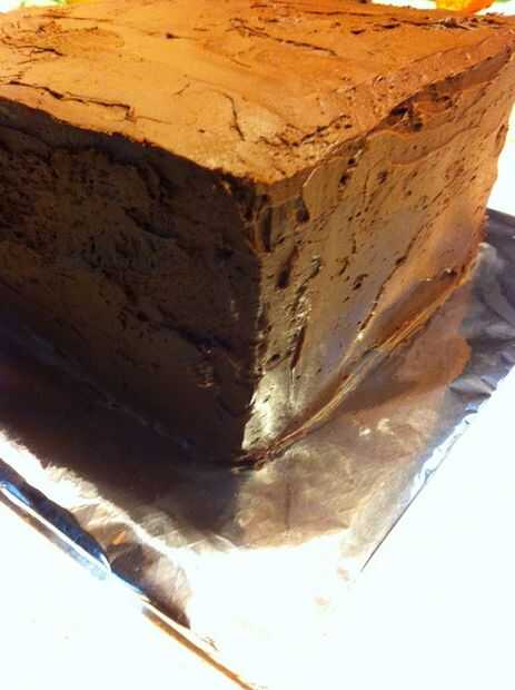 Como el niño de cumpleaños pidió específicamente no fondant o glaseado de crema de mantequilla que tenía que venir para arriba con otra opción. Usé una ganache (180 g choc oscuro, 1/2 taza espesada crema. Derrite lentamente en una sartén hasta que derrita. Fresco.) como mi mortero y un choc fudge crema (200g choc oscuro, 1/2 taza espesada crema, 70g de mantequilla derretida en un recipiente resistente al calor colocado sobre un cazo de agua hirviendo. Se funden y se combinan, enfriar completamente. Una vez enfriado, látigo! ) como la capa externa.