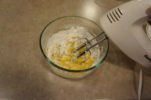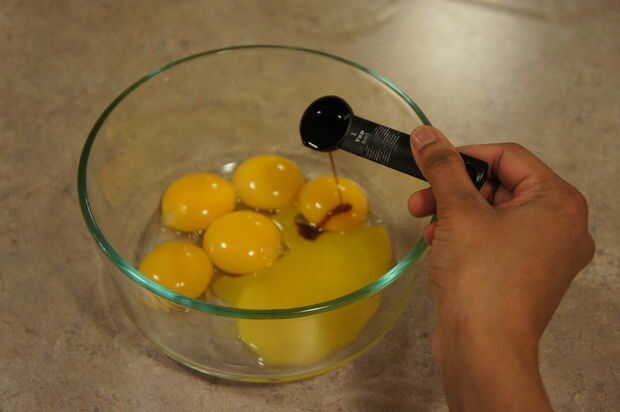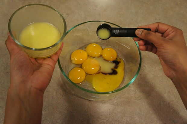 2) a las yemas de huevo, añadir el extracto de vainilla, la mantequilla derretida y el azúcar en polvo.