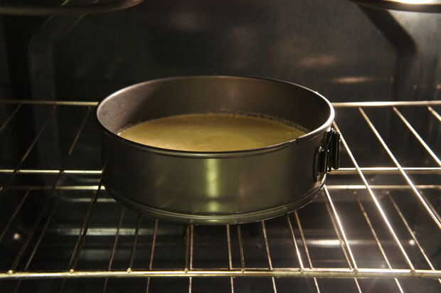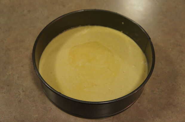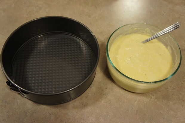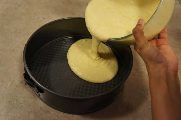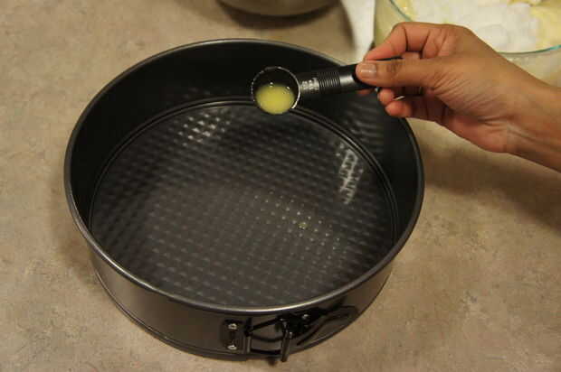 2) engrasar el molde para pasteles con mantequilla y vierta en la mezcla de pastel preparado en la sartén.