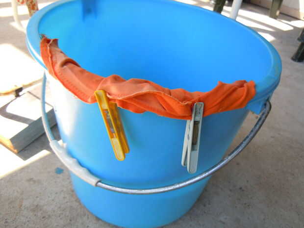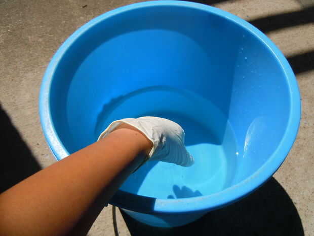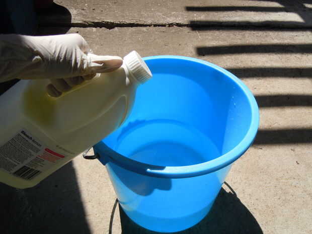 En un cubo, mezclar lejía y agua. No tenía ni idea de cuánto poner en de cada uno, así que comencé realmente cauteloso, con alrededor de 2L de agua y 0.02L de lejía. MALA IDEA. Que lleva siempre en. Yo seguí añadiendo lejía más y más como estaba llevando para siempre a tener un efecto. Le pedí a mi amigo, que esta más que hacer, y ella dice que ella va en una proporción 1:1.