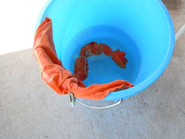 Una vez que la solución ha sido mixta, sumerja completamente la ropa. Para mí, además de la lejía de la corbata, quise crear un ombre (un gradiente del color). Para evitar que la parte inferior la mitad de mis ser blanqueado, vinculado al labio del cubo. : D