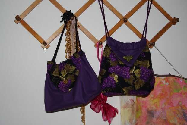 Produce el monedero con tela llana como trazador de líneas y luego revirtió el efecto para el próximo. He utilizado el mismo tipo de trenzado de las cintas, en diferentes colores y botones ha añadido en este estilo y Metal uva deja que se me ocurrió tener a mano para el otro estilo. Fueron encontrados hace años en el espacio y yo sabía que algún día encontraría un uso para ellos. Concuerdan muy bien.