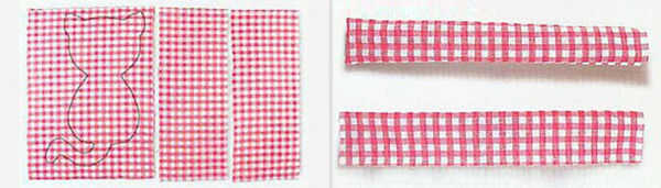 Dibujar la forma de gato sobre la tela de algodón. Corte dos tiras de rectángulos con el mismo tamaño. Doblar la tira por la mitad; coser los dos lados. Deje un espacio para convertirlo en desde adentro; luego coser el hueco. Lo mismo para la otra tira.
