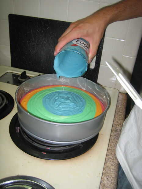 Ahora que su relleno es mezclado y coloreado. Debe refrescar su pan con corteza. Tomar la restante 1/2 cucharada de mantequilla y grasa de los lados de la olla. Ahora, vierte los colores de pastel de queso relleno en el centro de la corteza. Tome el primer color y vierte en el medio. Luego, vierta el siguiente derecho de color en el medio y el otro color será empujado hacia los bordes. Repetir. (Gracias de nuevo, Tolstoi78)