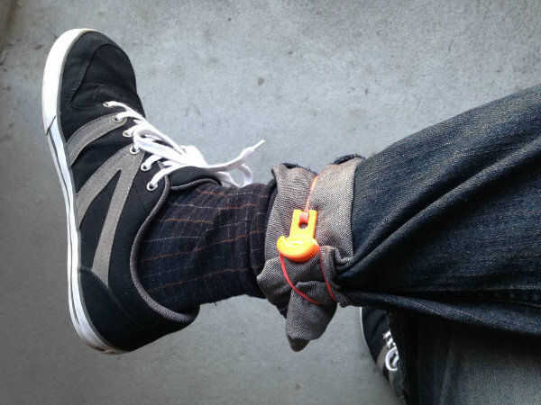- a utilizando un par de bragas lazos para evitar que su pantalón se enreden y lagrimeo cuando su salida de un sobre en su bicicleta.