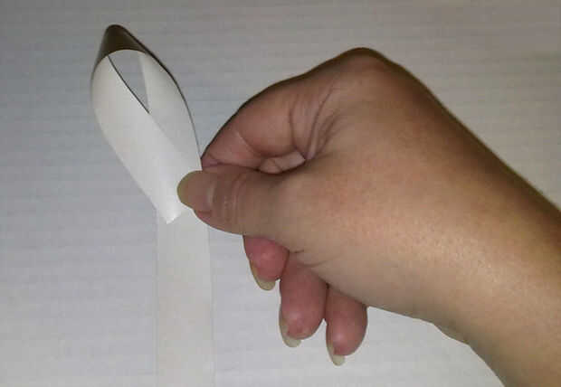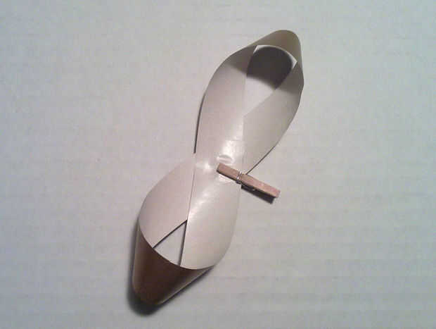 Tomar una de las tiras arrugadas y sostener con la cara de impresión hacia abajo. Doble más uno de los extremos (como se muestra en la foto). Entonces voltee el mismo fin para que un giro se produce en la franja y al final superpone el centro (como se muestra en la siguiente foto). Repita este proceso para el otro extremo. (Doble - luego del tirón). Ahora tienes lo que se ve como una "figura de ocho" forma (ver foto).