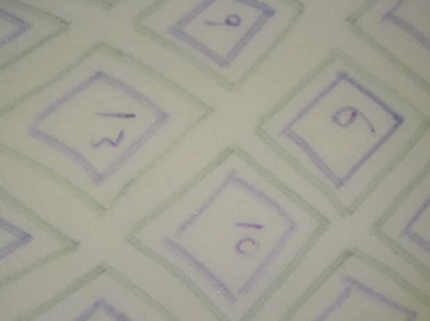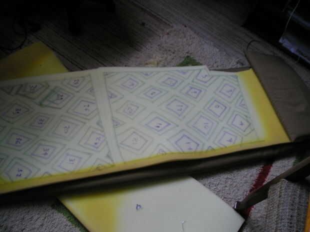 Ahora, teniendo el control listo, pasamos al colchon. Dividir el pedazo de espuma de 180 cm * 70 cm en 2 y pintarle rombos con un marcador.