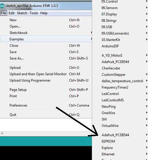 Una vez instalado, abra su IDE y compruebe su contexto Adafruit_PCD8544. En él encontrará el archivo pcdtest que es necesario.
