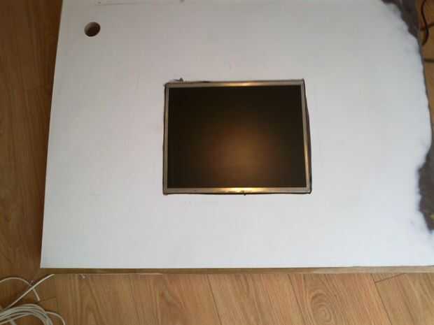 Coloque la pantalla lcd en el bisel de metal y coloque en el escritorio. Asegúrese de que se sienta bien y no se caiga del otro lado. puede empernar un pedazo de madera delgada para sostenerlo por la parte posterior.
