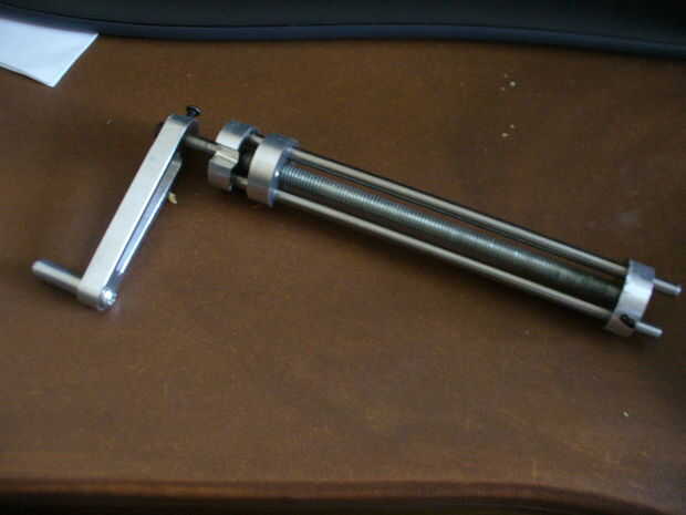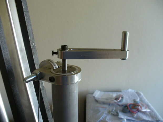 La bobinadora consta de una broca que gira de varilla roscada, sostenido cautivo superior e inferior, dos guían de varillas y un centerpeice roscado, que se mueve hacia arriba o hacia abajo cuando se gira la varilla roscada. Un buen mango fue compuesto para una fácil rotación. Todo el conjunto se ajusta hacia abajo dentro de la varilla de soporte principal y se lleva a cabo por los mismos tornillos como el pivote principal superior.
