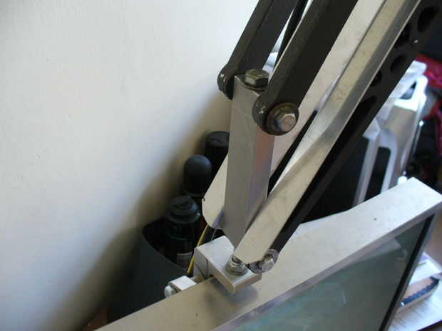 Un agujero de 8mm fue perforado por el centro de la placa de extremo verticales para montar el gancho de la vuelta final. El gancho de vuelta consiste en una L en forma de abrazadera y un perno de 8mm largo 150mm; una tuerca y rosca interior mantiene el perno en el soporte L. El perno es libre de girar para que la pantalla puede hacer frente en cualquier dirección. En el final de la vuelta gancho es un agujero de 8mm a través del cual se monta la pantalla, espaciadores fueron agregados para apretar este perno aumenta la fricción de la Unión, que permite inclinar la pantalla.