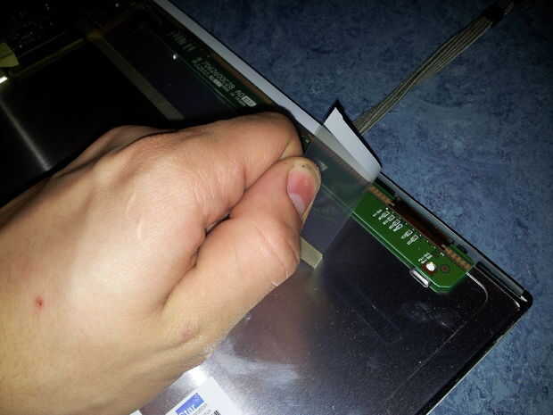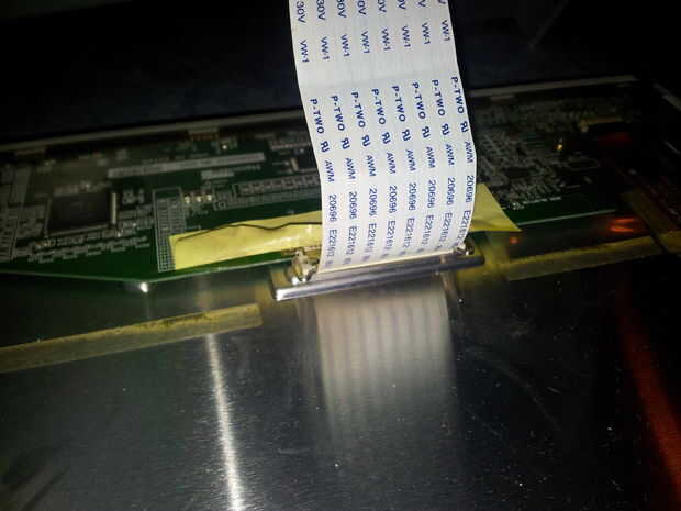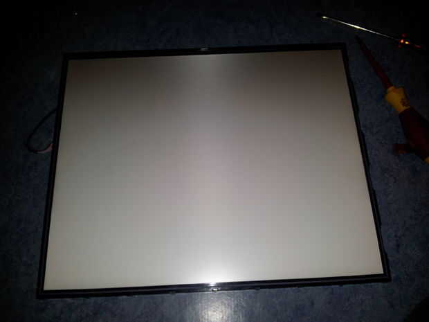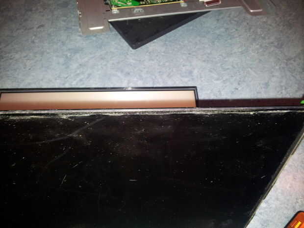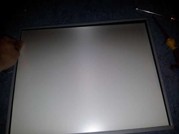 En la parte superior de la pantalla hay un cable de la flexión de la placa base a la placa lógica del panel LCD. Desenchúfelo presionando los dos pines de metal juntos y tiraran. En la placa lógica hay una cubierta de plástico. Retírela y desatornille la placa lógica. En un lado hay dos clips del metal. Dobló a distancia y en el lado existen clips de plástico. Presione con un destornillador y la estructura metálica debe salir. Ahora puede quitar el panel LCD y reemplazarlo con el plexiglás. Si desea puede poner una hoja de color entre la luz y el Plexiglas o quitar las hojas de la polarización para ampliar el ángulo de haz. Monte al monitor detrás juntos.