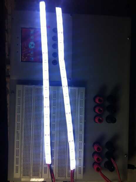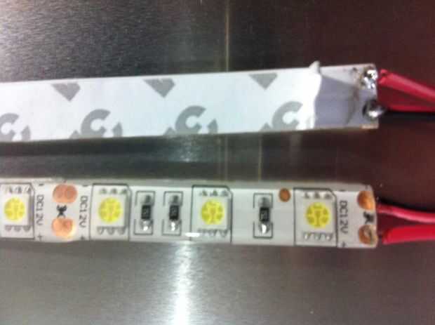 Suelde el cable en cada tira de LED, lo hice por rayar la cinta auta-adhesivo en la parte posterior de la almohadilla de la tira de cobre. Tomar nota de la polaridad y el color del cable a utilizar para asegurar que correcta potencial se proporciona en cada cojín.