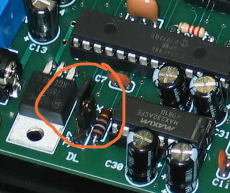 En primer lugar, establecer el puente (JP7, véase el cuadro) a la conexión de descarga, que está marcado con "DL". Tenga en cuenta que en la foto de arriba es no en la posición "DL", sino "TX", que se utiliza para el funcionamiento normal. Simplemente moverlo de allí para puentes el pasador de primero y segundo.