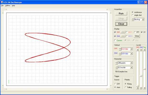 componentes reactivos como condensadores e inductores - un canal mirando el voltaje a través del componente, uno mirando a la corriente. O de la alimentación en dos ondas de diferente frecuencia y disfrutar de las parcelas resultantes de Lissajous. Es generalmente más fácil de establecer niveles, gatillo etc. en modo normal y después cambian en el modo X-Y. El registro de la muestra debe incluir al menos un período completo de la señal más lenta, un poco más es aún mejor. Una captura de pantalla de este modo se muestra a continuación (diagrama de Lissajous de la onda de seno dos, uno con el doble de la frecuencia de la otra).
