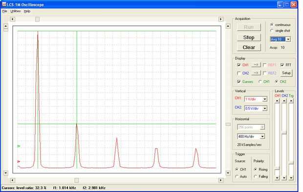 Basado en sugerencias de usuarios recientemente también se implementa un modo de visualización X-Y. En este modo, canal 1 proporciona la deflexión horizontal y 2 la desviación vertical. Este modo de visualización - conocida de osciloscopios de rayos catódicos clásico - proporciona una buena manera de ver p. ej.