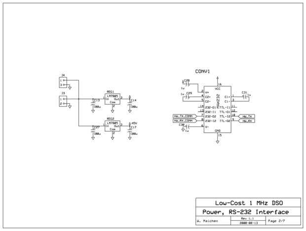 el RS-232 los niveles desde la PC, y también añade una capa de protección entre alcance y PC. Los datos se envían a 19200 baudios, que según mis pruebas es aproximadamente tan rápido como el microcontrolador puede leer los datos de la memoria, lo que significa que un aumento de velocidad no se traduce en un aumento en la tasa de actualización de pantalla.