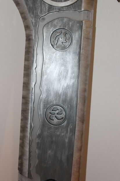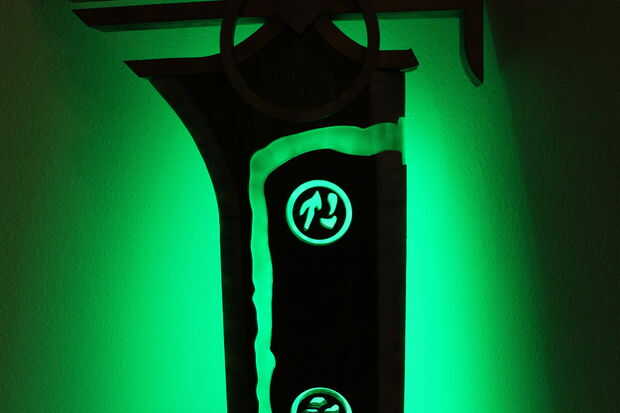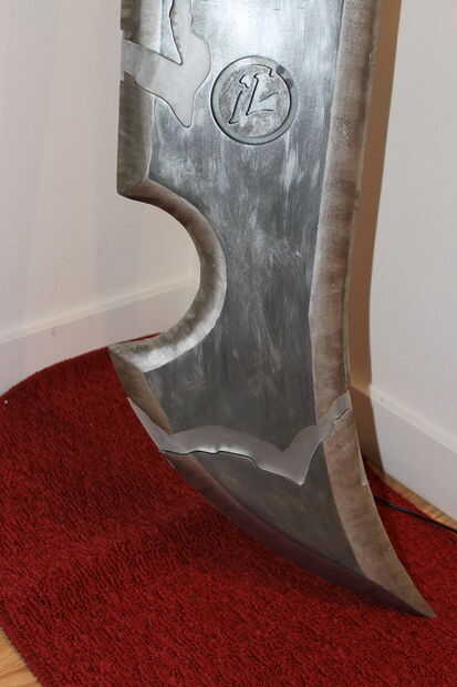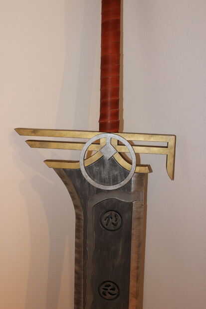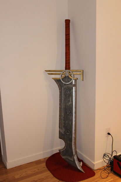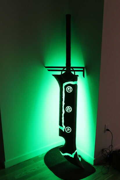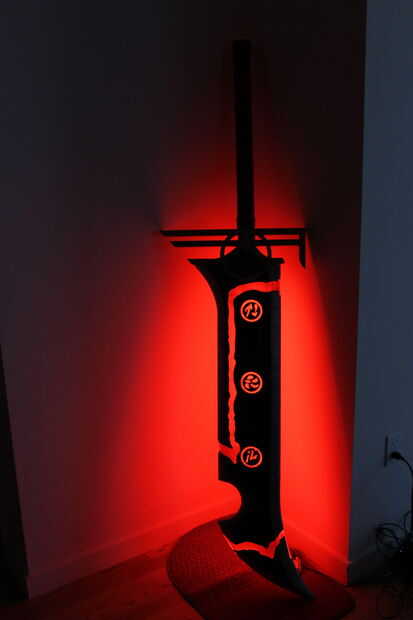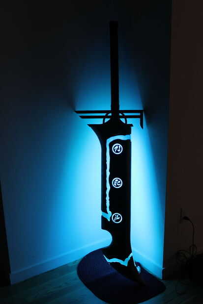 Esto tiene ligeras modificaciones del arte real que existe. Tomé el diseño de la piel "Riven redimida" para hacerlo. La espada mide 6 pies de altura y pesa sobre 30ish libras. Su marca de madera y acrílico. El mango se envuelve con cuero. En el interior y en la parte posterior son luces LED RGB que pueden hacer muchos diversos colores.