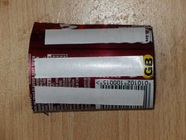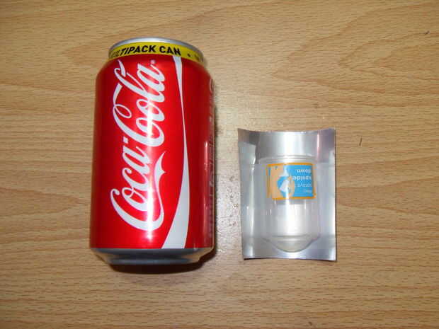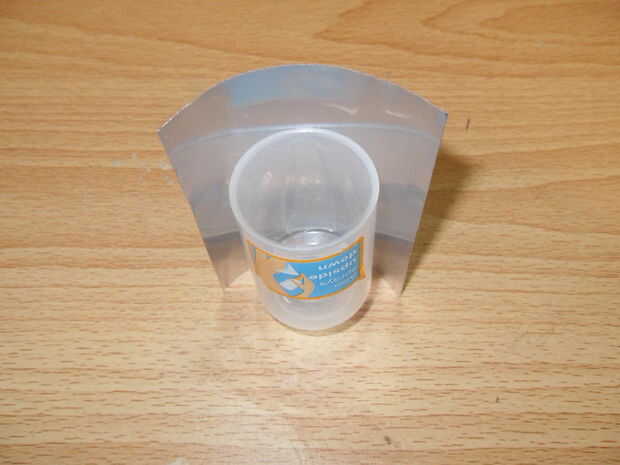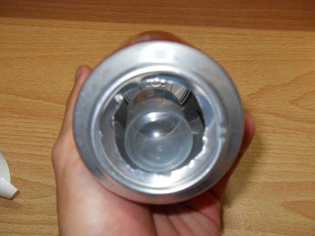 Nada menos que el diámetro del orificio en el fondo de la lata (44mm) sería bueno. La mía es la tapa de una botella de crema de sol. Puede usar cualquier cosa de ese tamaño. por ejemplo plástico vidrio de tiro, plástico probetas graduadas de Schweppes bebidas, tapas de botellas grandes o una lata de película (si eres lo suficientemente viejo para recordarlos). Cuanto más líquido es mejor.