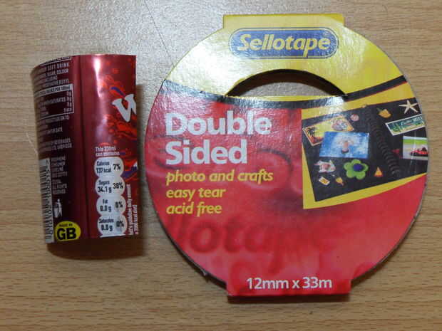 Antes de retirar la cinta de copia de seguridad, comprobar se forma a través del agujero y luego retire el papel protector de la cinta e insertar a través del orificio en la parte inferior de la lata. Cuando se pega quiere el depósito de agua situado en el lado opuesto del agujero potable.
