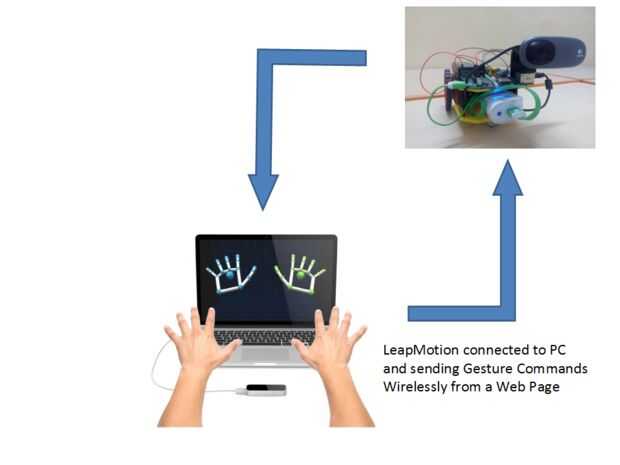 El Raspberry Pi a bordo del Robot también tiene una Webcam USB que flujos de viven nuevo video al usuario que puede verse en un navegador Web. La biblioteca LeapMotion JavaScript incrustada en esta página web los procesos de gestos con las manos y envía señales de control hacia el Robot, que entonces se mueve en consecuencia.