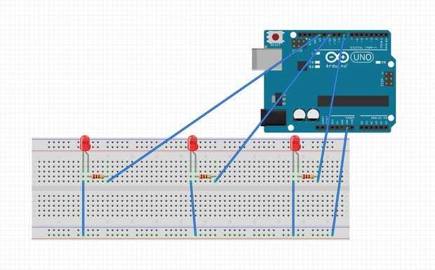 - Conectar LEDs a la placa y conectar las resistencias de 10 k a cada uno de los Led que la corriente que fluye a través de la + ve plomo no daña el LED.